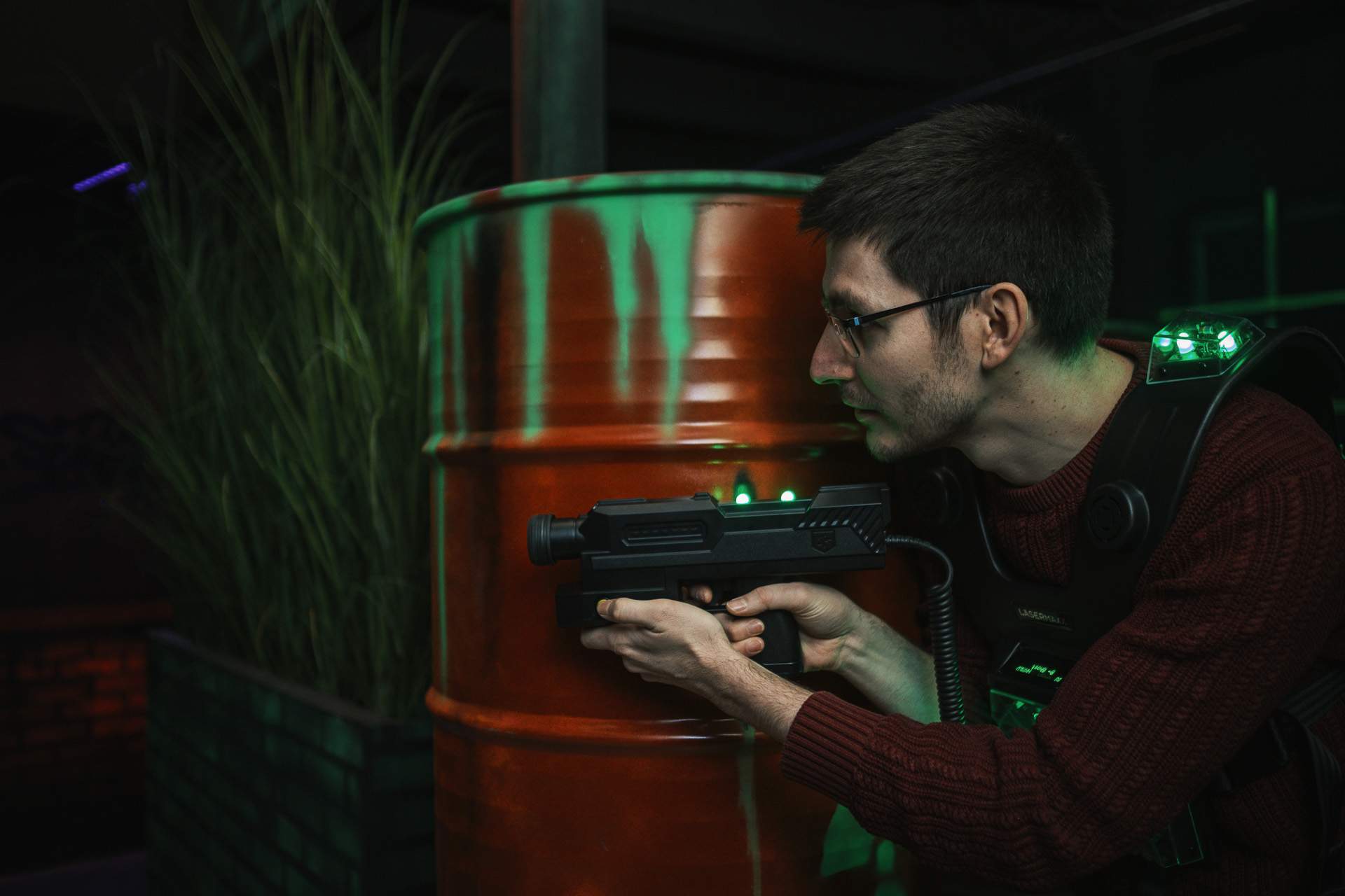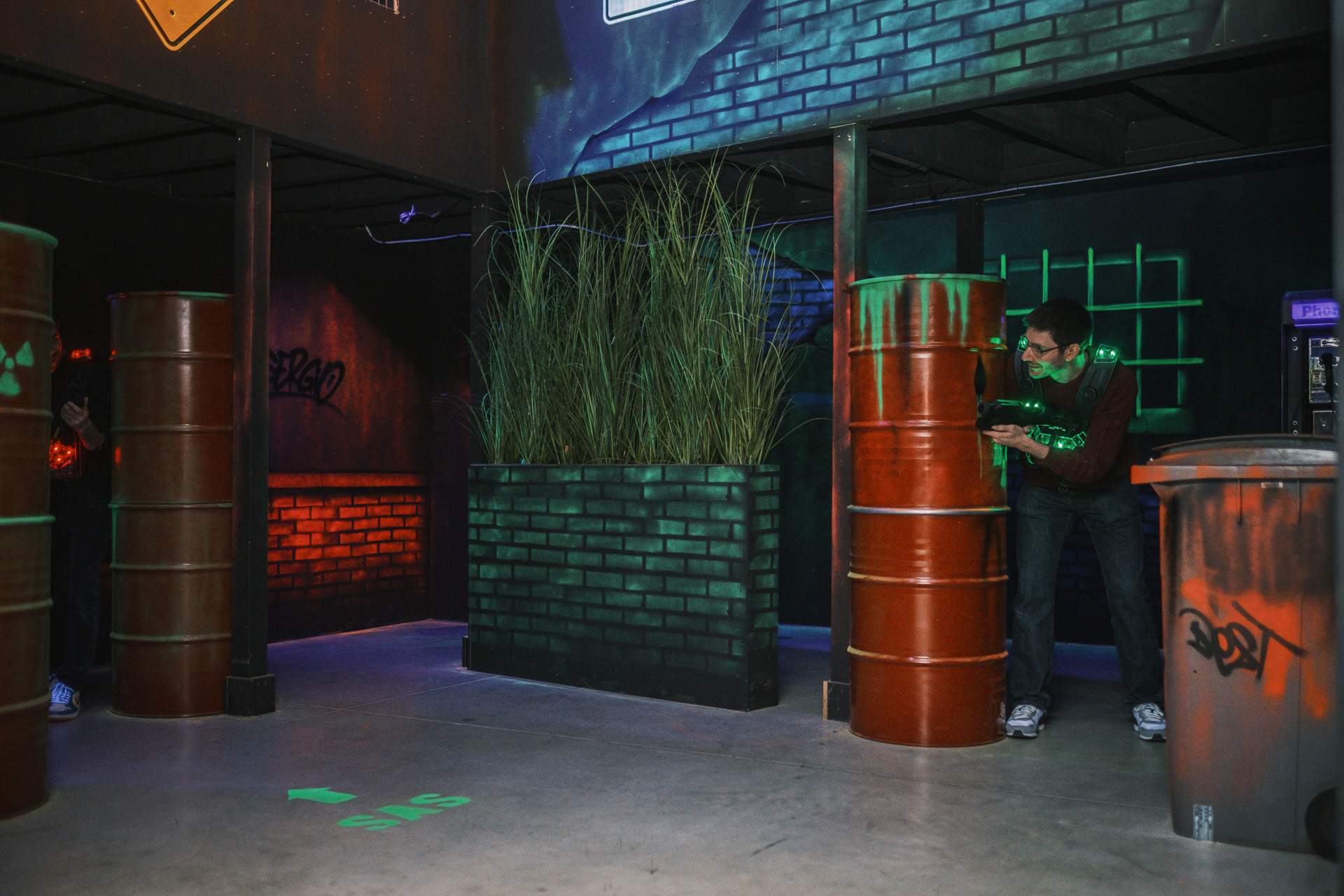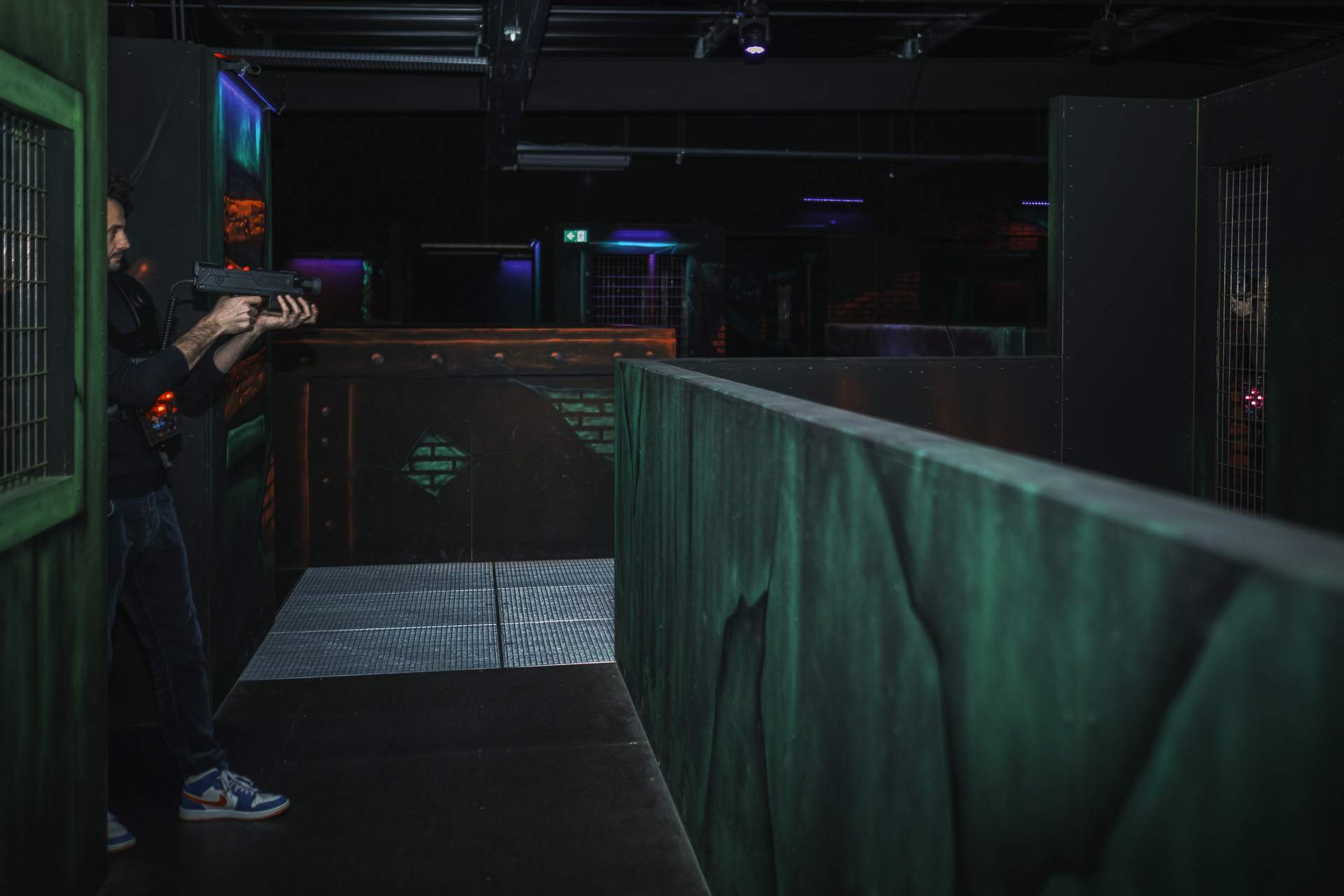 Vous saisissez votre pistolet laser et observez la situation. Deux adversaires sur votre gauche, l’un deux vous a repéré. Se précipiter serait une erreur, alors vous vous mettez à couvert. Vous risquez un rapide coup d’œil de votre cachette et vous réfléchissez aux différentes options. Simplement passer le pistolet au-delà de l’obstacle n’est pas sans risque, car il y a aussi un capteur sur le gun, tellement de capteurs, impossible de tricher chez Lasermaxx !